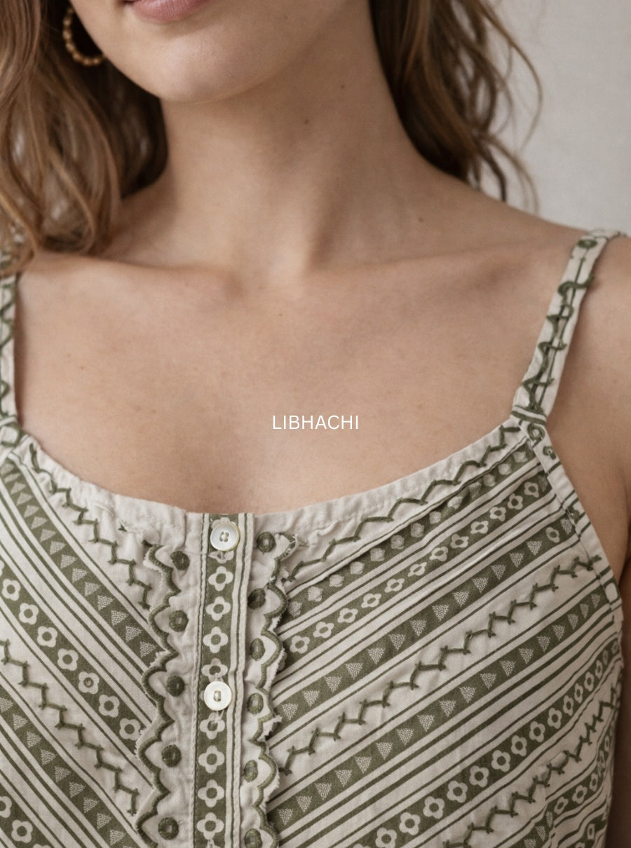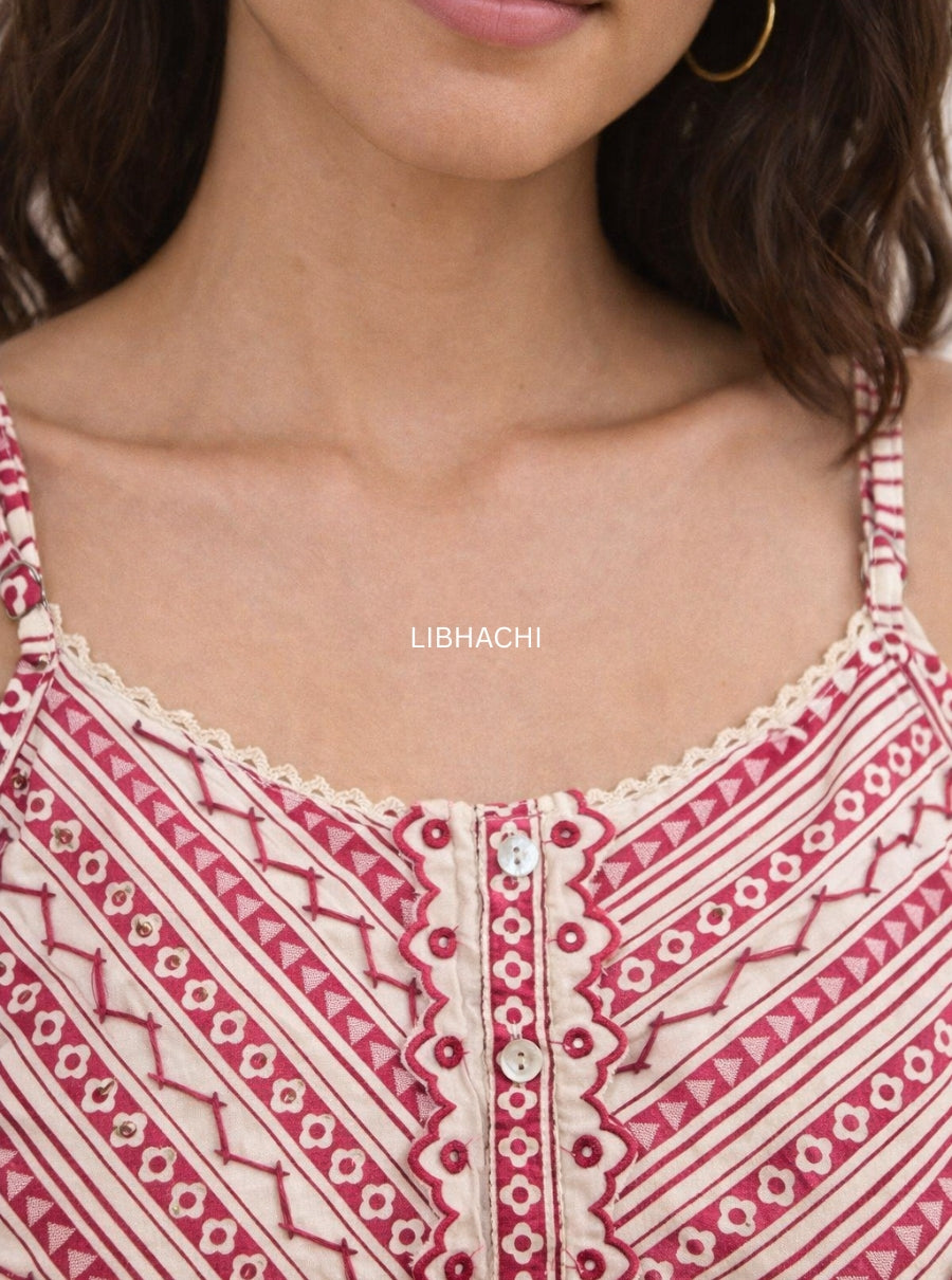 The neckline is beautifully detailed with fine embroidery and intricate handwork, adding a handcrafted charm that elevates the simplicity of the outfit. The sleeveless strap design keeps the look light and breathable, making it perfect for warm days and relaxed styling.